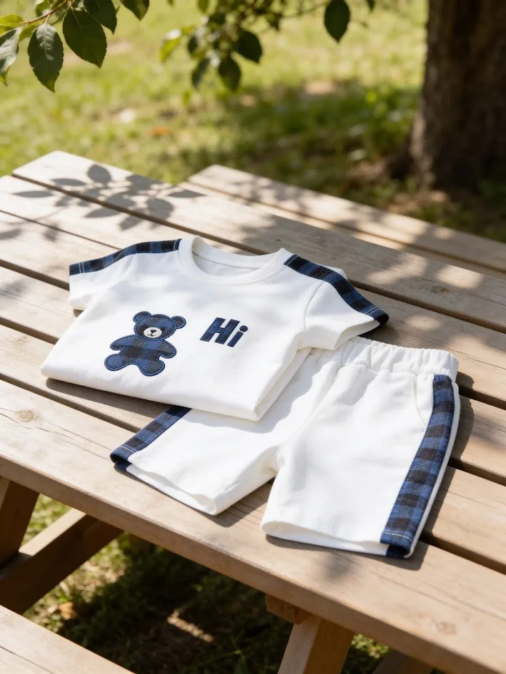 Βρεφικό σετ με μπλούζα αρκουδάκι και σορτσάκι. Άνετο και δροσερό outfit για καθημερινή χρήση.