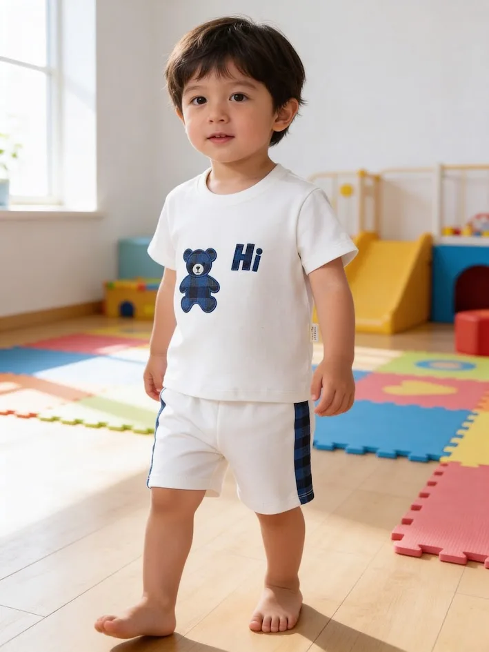 Ένα άνετο και μοντέρνο βρεφικό σετ ιδανικό για καθημερινές εμφανίσεις με στυλ. Το σετ περιλαμβάνει κοντομάνικη μπλούζα σε λευκή απόχρωση με χαριτωμένο σχέδιο αρκουδάκι και τη λέξη “Hi”, καθώς και σορτσάκι με ελαστική μέση για άνετη εφαρμογή.