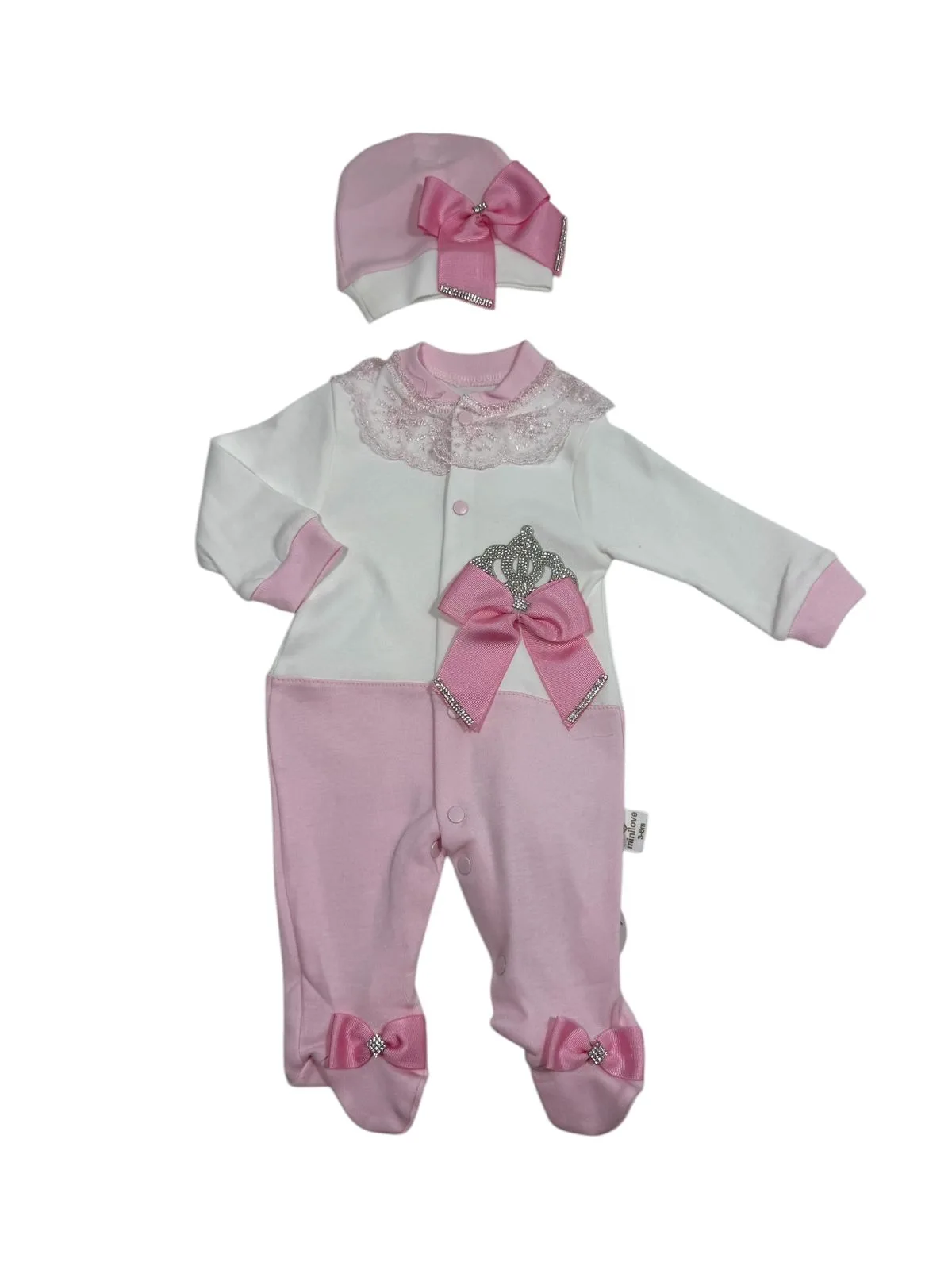 Βρεφικό Σετ Ροζ Φορμάκι με Σκουφάκι και Βασιλική Κορώνα & Φιογκάκια (100% Βαμβακερό)