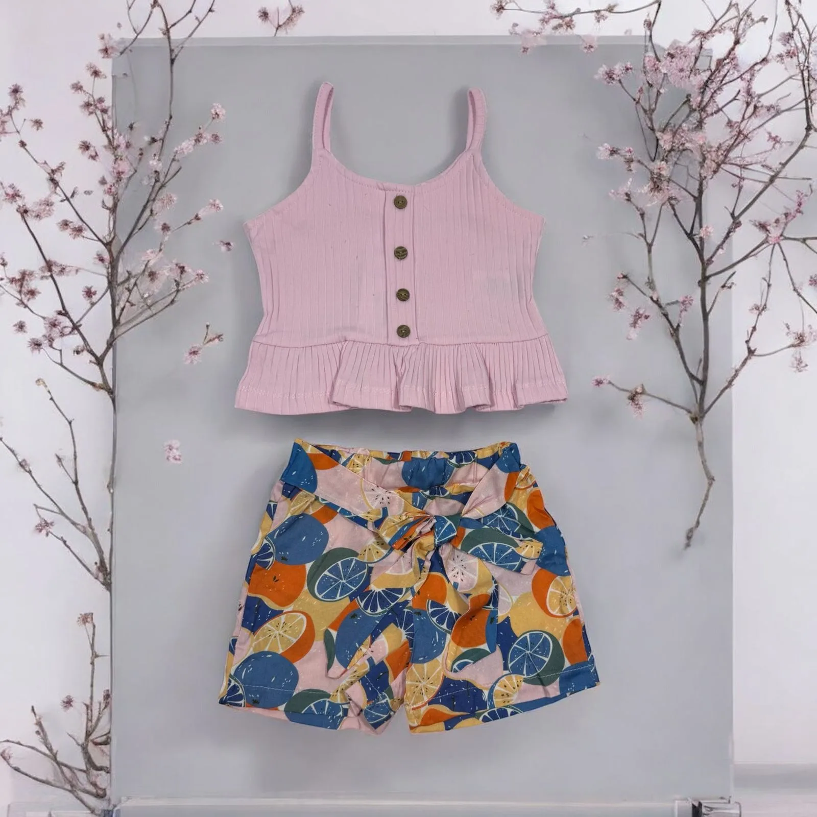 - Σορτς: Με ένα ζωντανό και παιχνιδιάρικο φρουτένιο σχέδιο σε πορτοκαλί, μπλε και κίτρινους τόνους, αυτό το σορτς διαθέτει ελαστική μέση και διακοσμητικό φιόγκο, εξασφαλίζοντας τέλεια εφαρμογή και άνεση.
