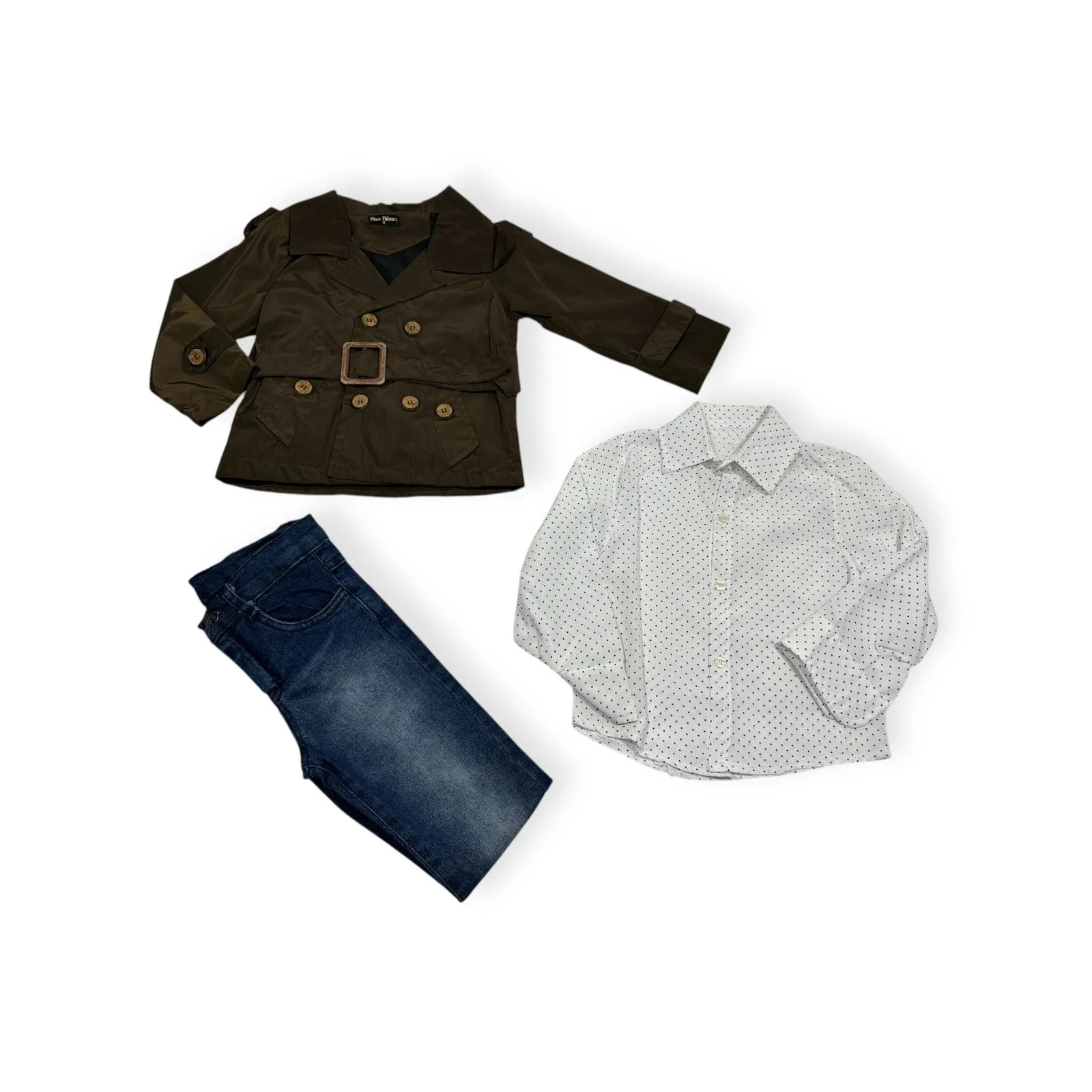 Ανανεώστε την γκαρνταρόμπα του μικρού σας με αυτό το στυλάτο σετ για παιδιά! Περιλαμβάνει κομψή καπαρντίνα σε κλασικό λαδί χρώμα με διακριτικές λεπτομέρειες κουμπιών και ζώνης, προσδίδοντας μια μοντέρνα και διαχρονική εμφάνιση. Το σετ ολοκληρώνεται με άνετο τζιν παντελόνι σε μοντέρνα γραμμή, ιδανικό για καθημερινές αλλά και πιο επίσημες περιστάσεις. Κατασκευασμένο από υψηλής ποιότητας υλικά για άνεση και ανθεκτικότητα, αυτό το σετ είναι ιδανικό για κάθε μικρό εξερευνητή με στυλ!