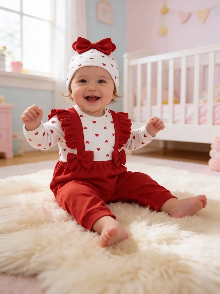 Χαρίστε στυλ και άνεση στο μωρό σας με αυτό το γλυκό βρεφικό σετ 3 τεμαχίων. Περιλαμβάνει μακρυμάνικο κορμάκι σε λευκό χρώμα με διακριτικό μοτίβο από μικρές κόκκινες καρδιές, σαλοπέτα-φορμάκι σε έντονο κόκκινο με διακοσμητικούς φιόγκους και βολάν τιράντες, καθώς και ασορτί καπελάκι με μεγάλο φιόγκο.