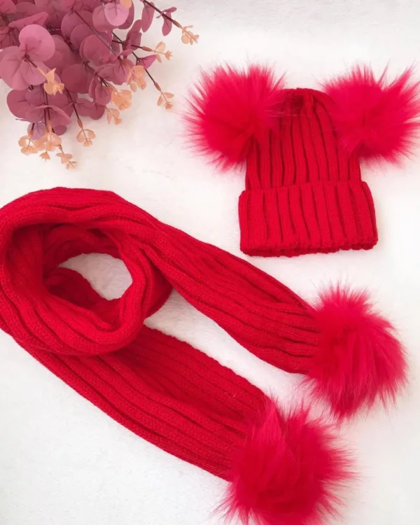 Σετ Παιδικό Πλεκτό Σκουφάκι & Κασκόλ με Γούνινα Pom-Poms(Κ)