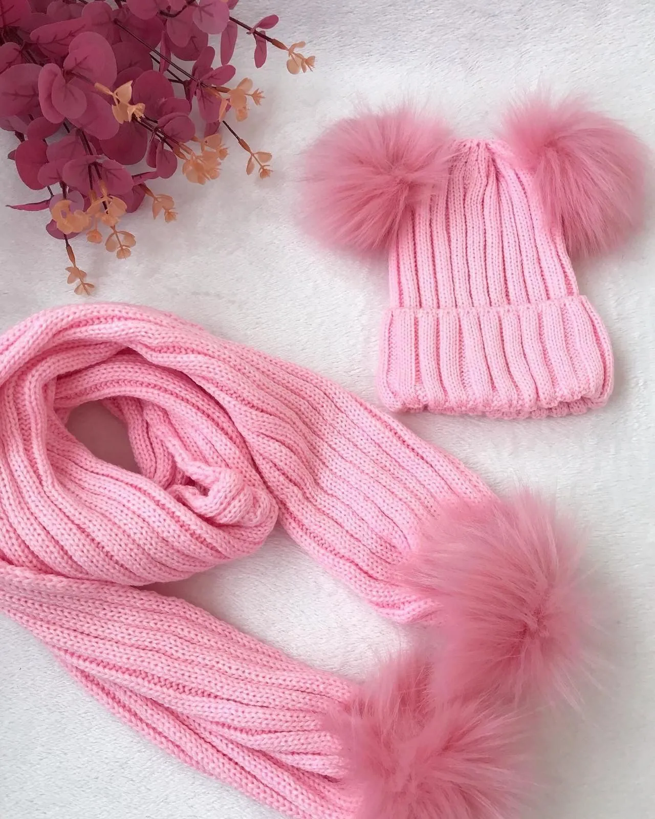 Σετ Παιδικό Πλεκτό Σκουφάκι & Κασκόλ με Γούνινα Pom-Poms (Ρ)