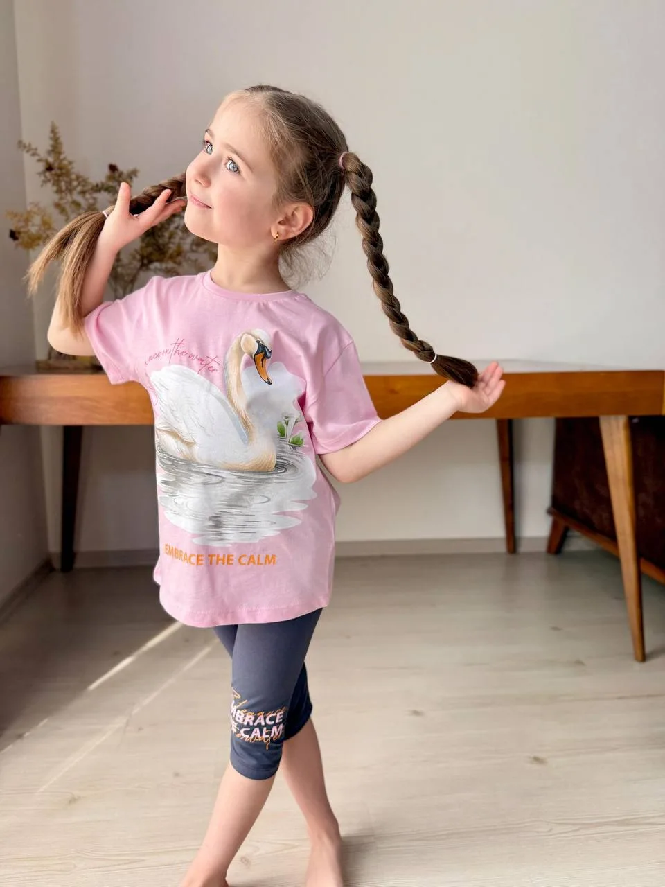“Embrace the Calm” Σετ για Κορίτσια – Ροζ Μπλουζάκι με Κύκνο & Γκρι Κολάν