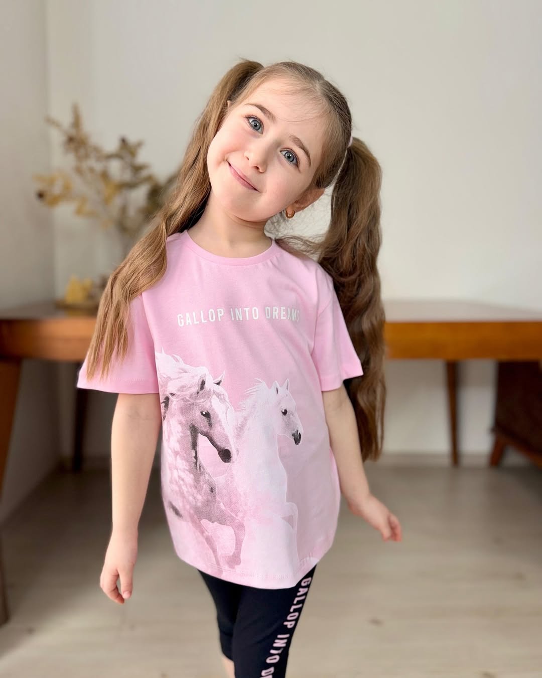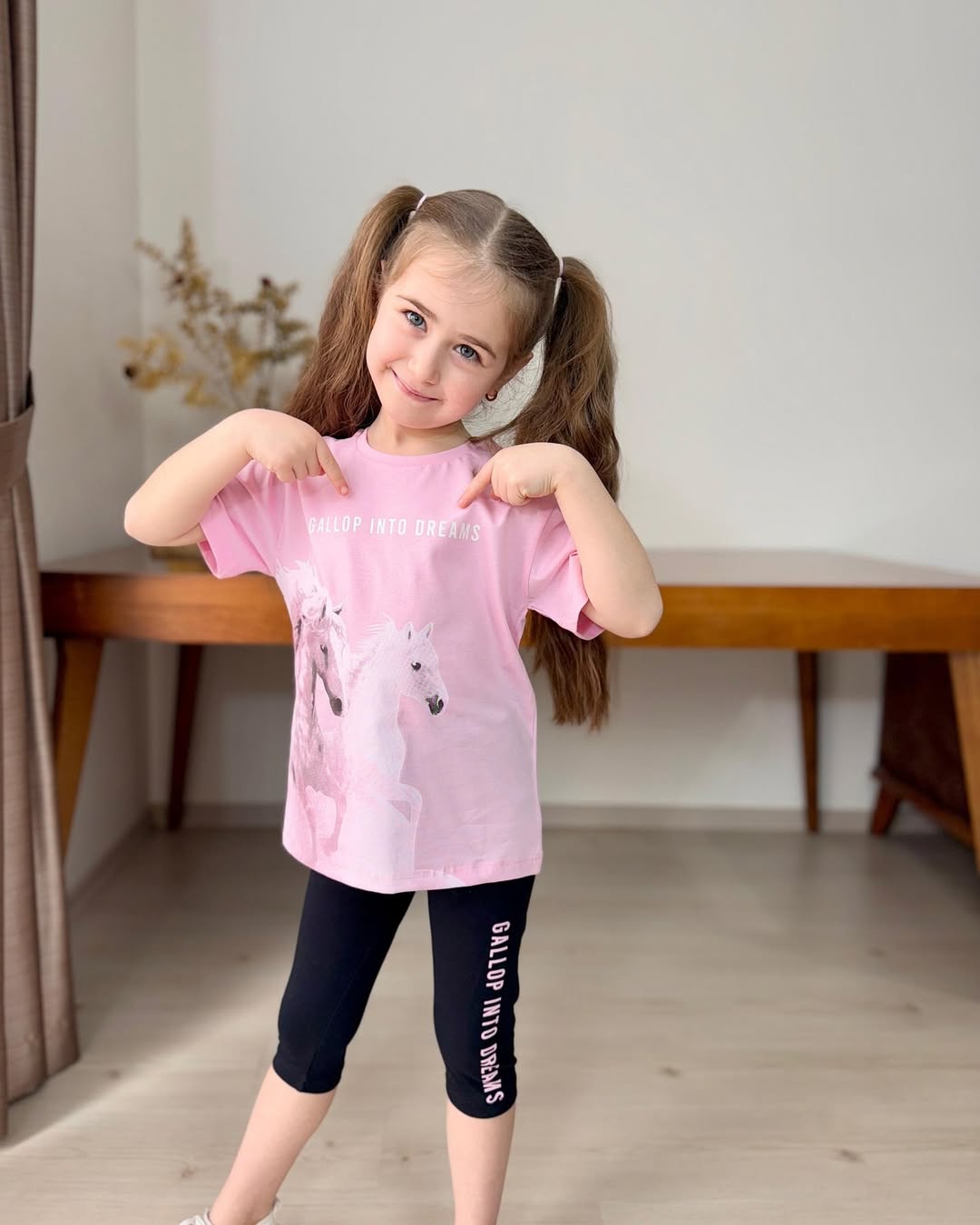 Ένα μαγευτικό και άνετο σετ για τις μικρές ονειροπόλες! Περιλαμβάνει ένα ροζ κοντομάνικο μπλουζάκι με εντυπωσιακή στάμπα αλόγων και ένα πρακτικό μαύρο κολάν με την φράση “GALLOP INTO DREAMS”. Ιδανικό για τις καθημερινές τους περιπέτειες και τα παιχνίδια.