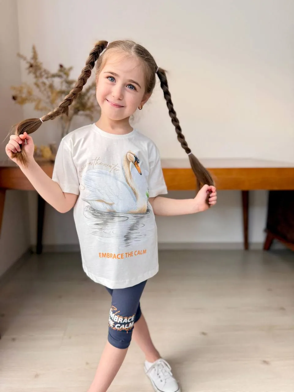 Αγκαλιάστε την ηρεμία και την κομψότητα με το παιδικό σετ “Swan Serenity”! Αυτό το άνετο σύνολο περιλαμβάνει μια λευκή μπλούζα με ένα όμορφο σχέδιο ενός κύκνου που γλιστρά σε ήρεμα νερά και τη φράση “EMBRACE THE CALM”. Το σετ ολοκληρώνεται με ένα πρακτικό γκρι κολάν με την ίδια φράση τυπωμένη στο κάτω μέρος του ποδιού.