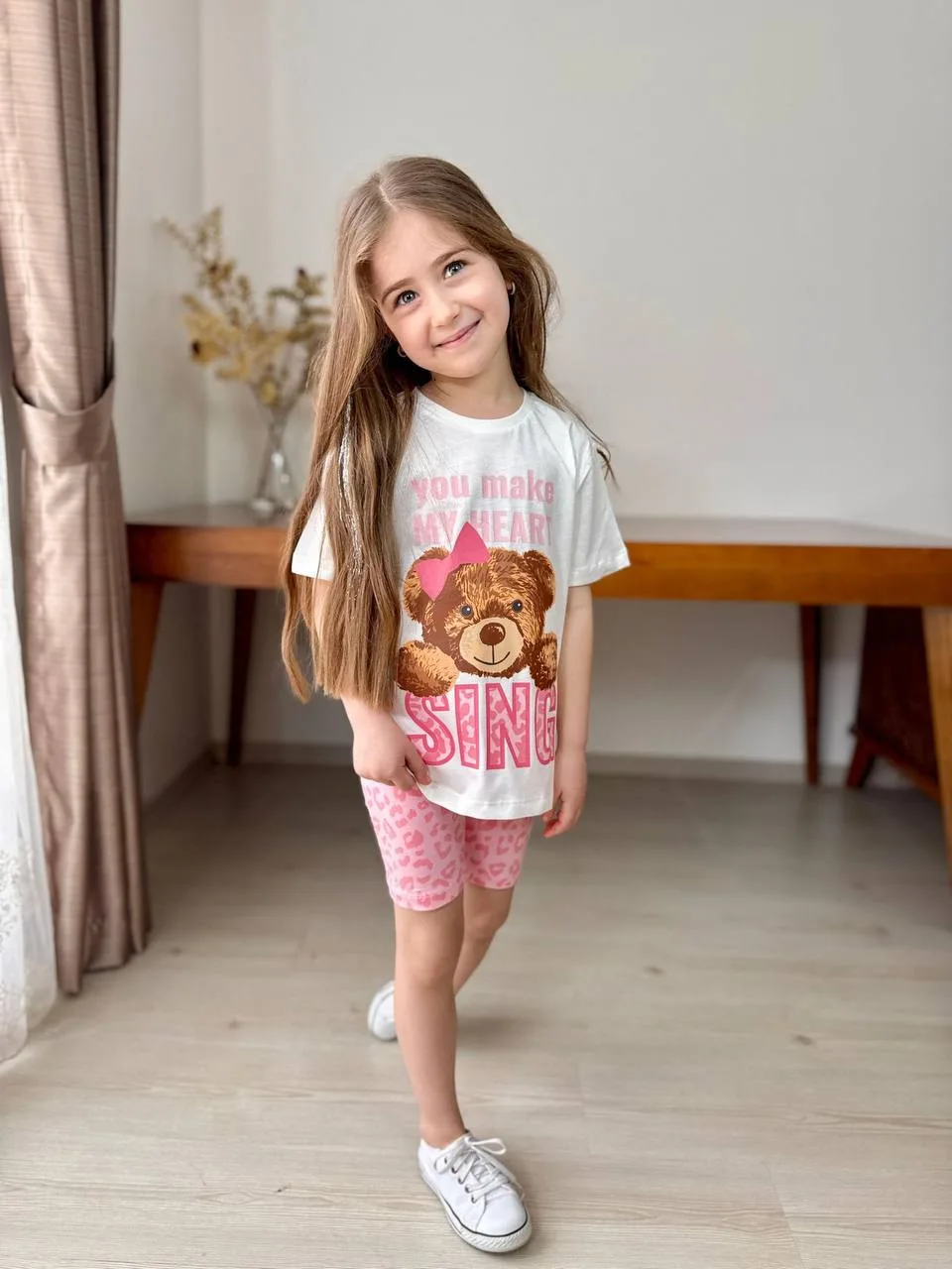 Γεμίστε την ημέρα με αγάπη και χαρά με το παιδικό σετ “Teddy Love”! Αυτό το γλυκό σύνολο περιλαμβάνει μια άνετη λευκή μπλούζα με ένα αξιαγάπητο σχέδιο ενός αρκουδιού με ροζ φιόγκο και την φράση “You make my heart sing”. Το σετ ολοκληρώνεται με ένα παιχνιδιάρικο ροζ σορτς με διακριτικά λευκά πουά.